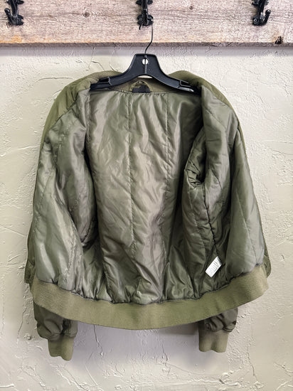 Description : Olive green bomber jacket with a ribbed collar, cuffs, and hem, a central zipper, two front flap pockets with snap buttons, and a zippered utility pocket on the left sleeve; the fabric is lightweight and slightly shiny nylon
