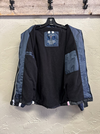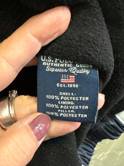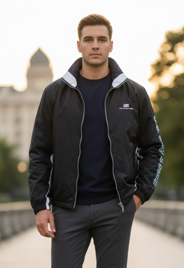 Description : Front-zip black nylon windbreaker with a high white stand collar, white and navy side panels and piping, elastic hem and cuffs, and a small U.S. Polo Assn. logo with an American flag on the left chest. The jacket has two front welt pockets and a full-length silver zipper.