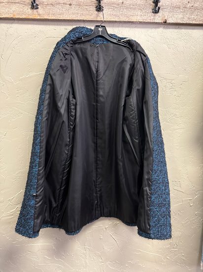 Description : Vintage long textured tweed coat in dark navy-blue and black with a subtle geometric weave, featuring a notched collar with black trim, double-breasted black buttons, trimmed welt pockets, long sleeves, and a black lined interior. The coat has a straight, mid-calf silhouette with a slightly boxy vintage cut.
