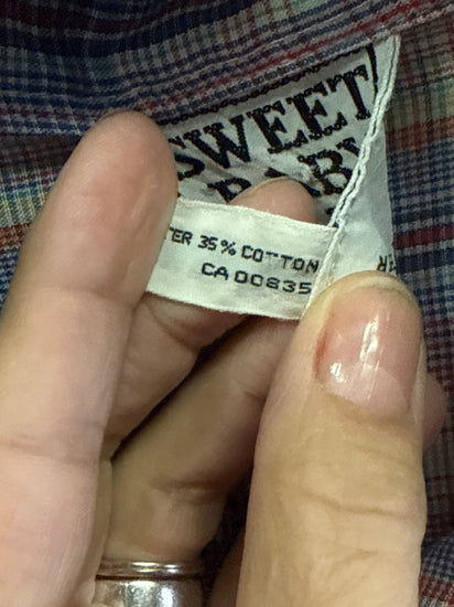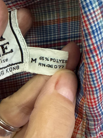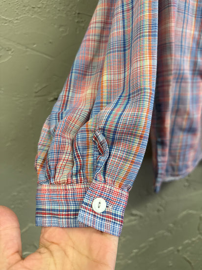 Description : Vintage long-sleeve collared plaid button-up shirt in soft pink, blue and white tones with a partial button placket, single chest pocket, and lightweight cotton-like fabric.