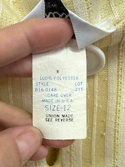 Description : Vintage knee-length dress in a soft buttery yellow with subtle diagonal and vertical stripe texture, featuring a round neckline with a keyhole and single button closure, cap sleeves, and a gathered elastic waist