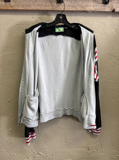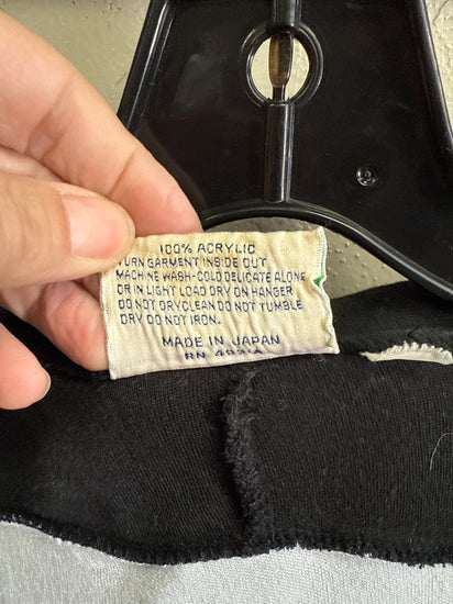 Description : Vintage 1970's, made in Japan, zip-up track jacket with a light gray front panel, black sleeves and shoulders, and red-and-white striped cuffs, hem, and sleeve accents.