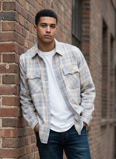 Description : Vintage Levi's long-sleeve shirt featuring a pale rainbow plaid pattern with two chest pockets.