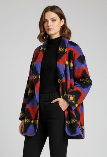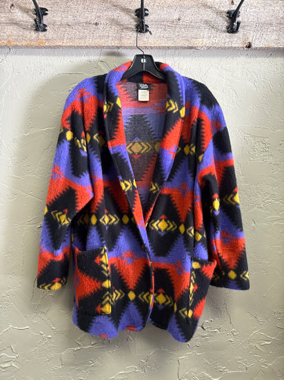 Description : Vintage fleece cardigan in a bold native-inspired print featuring dominant red, purple, black and yellow accents, with a shawl collar and front patch pockets