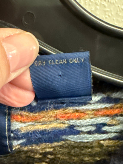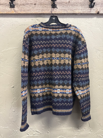 Description : Vintage, limited edition wool and silk sweater featuring a fair isle pattern with brown, tan, and light blue geometric shapes and stripes. The sweater has a crew neck and long sleeves.