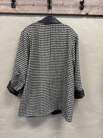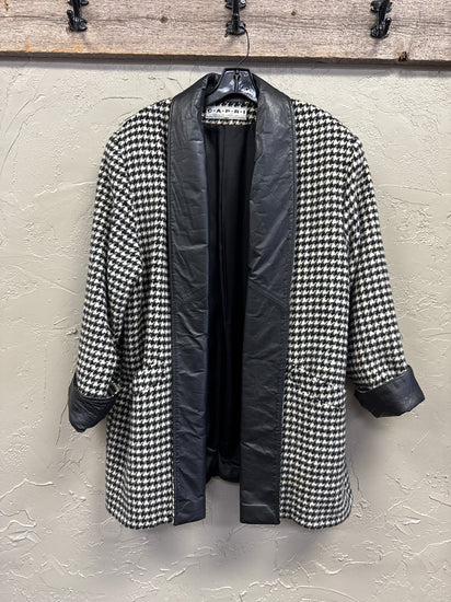 Description : Oversized vintage houndstooth coat in black and white with a wide black leather shawl lapel, turned-up cuff trim, open front and visible front patch pockets. The coat has a boxy, relaxed silhouette with three-quarter sleeves and a smooth black inner lining.