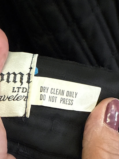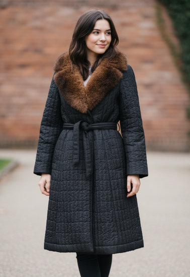 Description : Vintage long black quilted coat with a wide brown fur shawl collar and a self-tie belt at the waist, featuring an A-line silhouette and long sleeves.