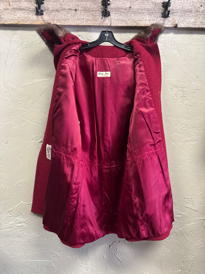 Description : Long A-line wool coat in a deep red hue with a brown fur collar, three front buttons, and slanted flap pockets; mid-calf length with long sleeves and a tailored, vintage silhouette.