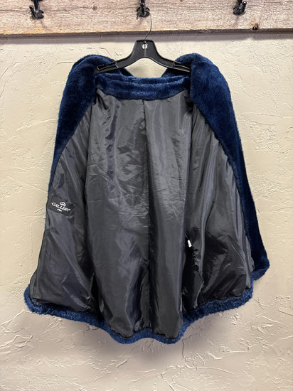 Description : A plush navy faux-fur hooded jacket with a front zipper, long sleeves, and hidden welt pockets. The oversized silhouette shows a soft, glossy pile with elasticized cuffs and hem for a cozy fit.