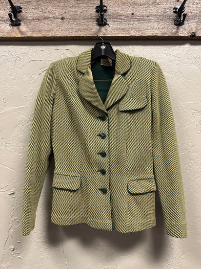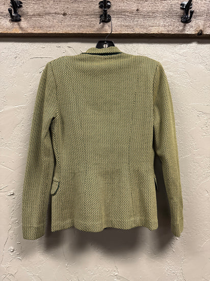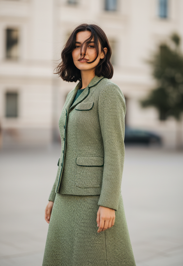Description : Vintage two-piece skirt and blazer set in a light yellow-green tweed with fine dark diagonal stripe texture; the fitted blazer has a notched collar, five front buttons, piped flap pockets and a small chest pocket, paired with a matching A-line skirt