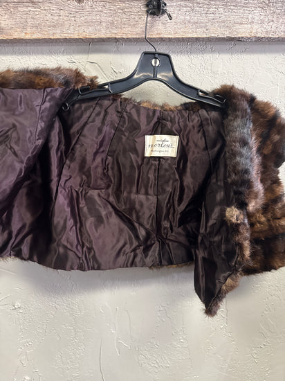 Description : Vintage brown and black striped fur capelet with a satin lining visible at the neckline.
