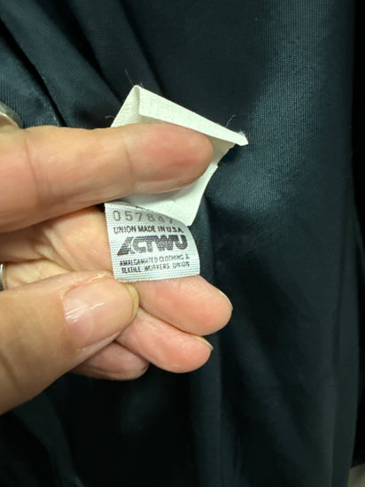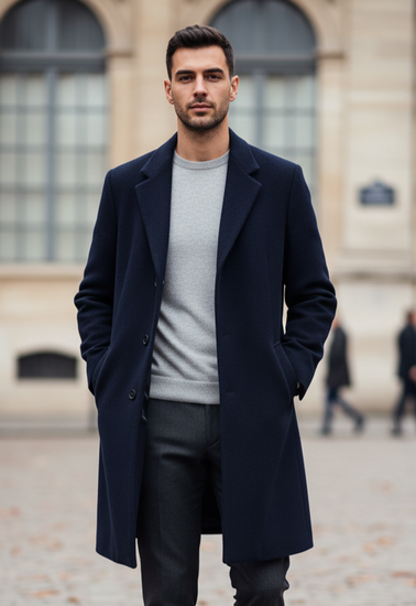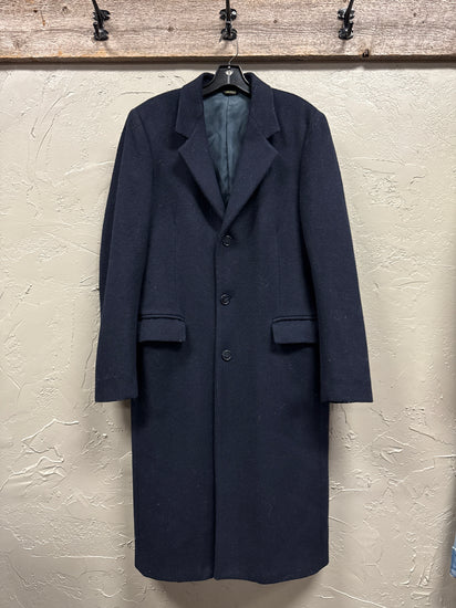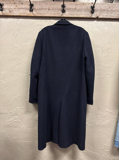 Description : Vintage long, single-breasted navy wool coat with notch lapels, two front flap pockets, two visible buttons, and a smooth dark satin inner lining; straight cut with full-length sleeves.