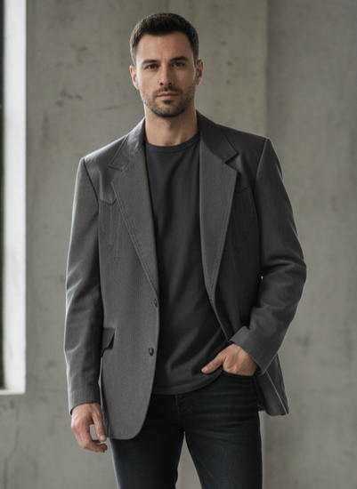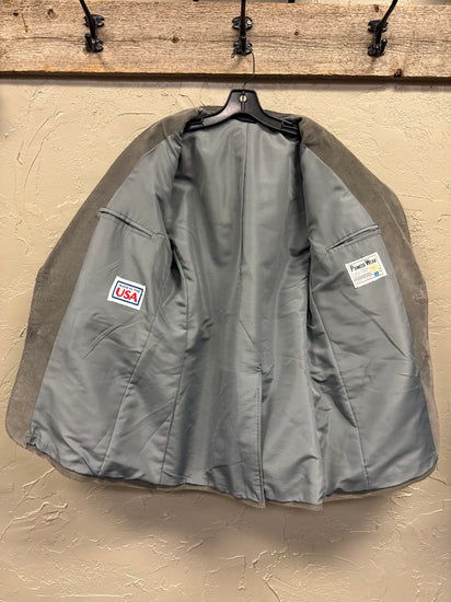 Description : Vintage grey corduroy blazer with leather accents on the lapels, pockets, and yoke, featuring a two-button closure and decorative stitching.