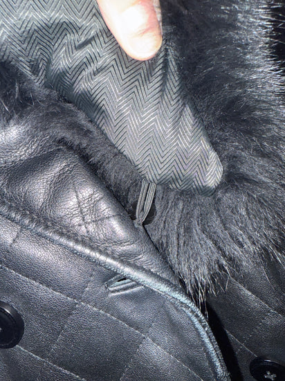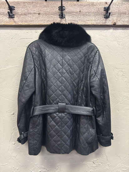Description : Vintage black quilted leather jacket with a prominent (detachable) black fur collar and a matching tie belt