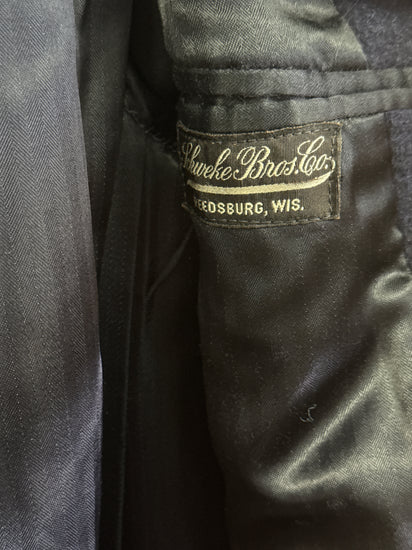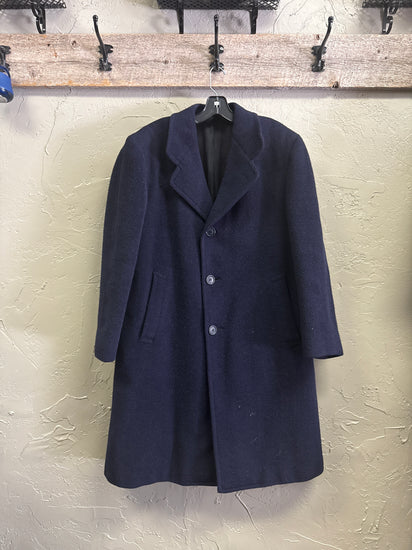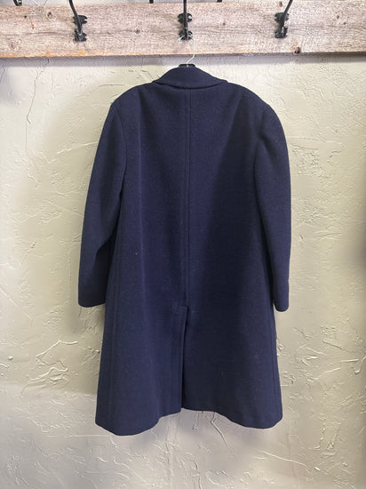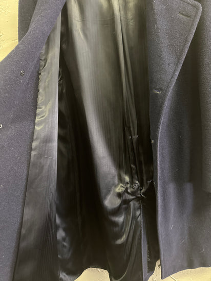 Description : Long vintage navy wool single-breasted coat with a notched lapel, front buttons, vertical welt pockets and a smooth dark lining. Price reflects damage to the inner lining.