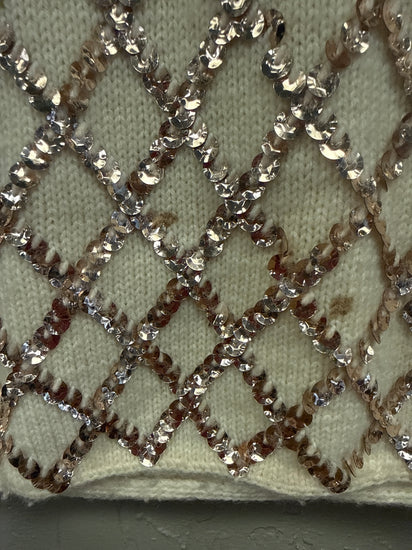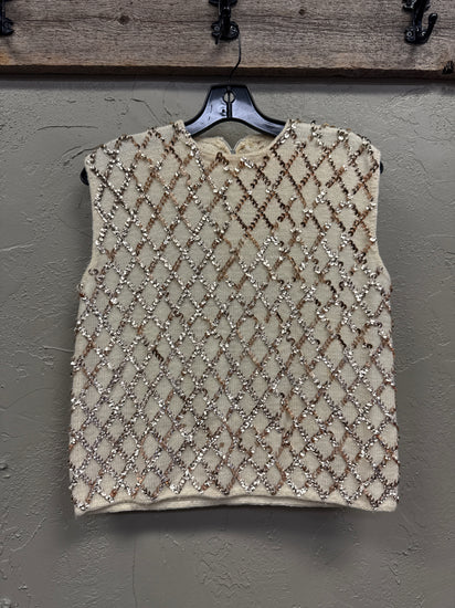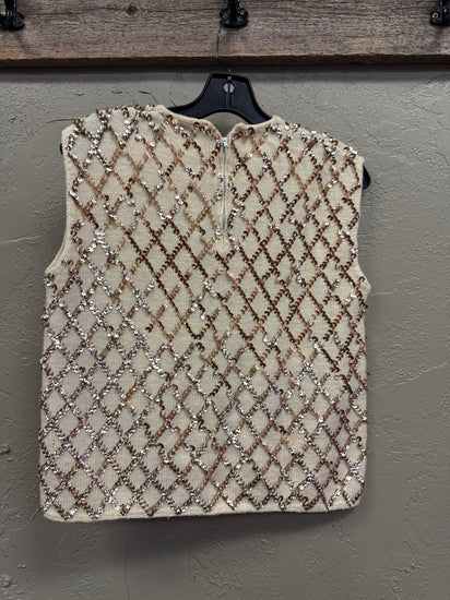 Description : Sleeveless, possibly hand made, cream-colored knit vest adorned with a diamond-shaped pattern of copper sequins. It features a round neckline and a zipper closure at the back. Price reflects staining in pictures