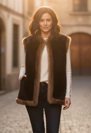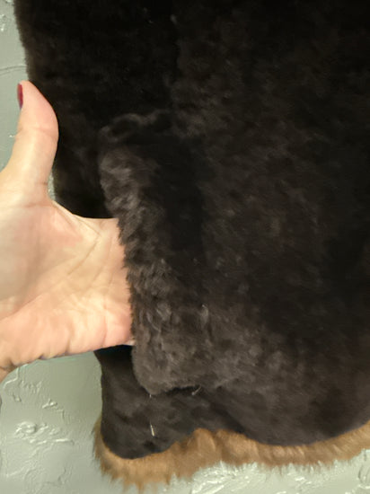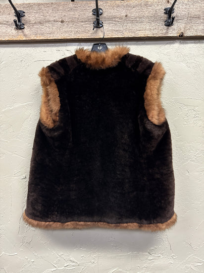 Description : Beautiful vintage piece out of Taos, NM! You will turn heads in this open-front fur vest in deep dark brown with lighter warm brown trim along the collar, front edges and hem; plush texture with paneled construction on the shoulders and a smooth inner lining. The vest is hip-length and has a rich, warm feel