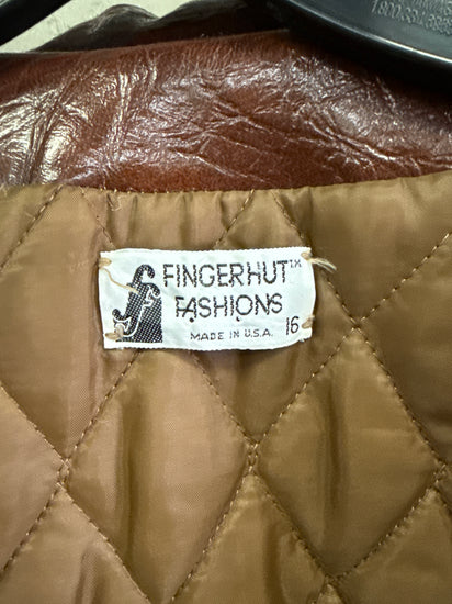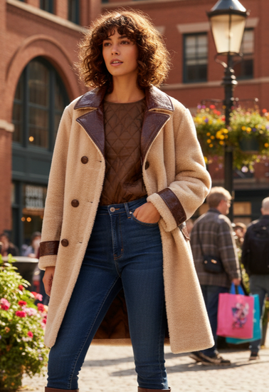 Description : Vintage mid-length double-breasted shearling coat in a warm beige/cream with glossy dark brown leather collar, lapels, pocket trims and cuff accents, featuring six front buttons and a slightly boxy silhouette. The front shows two flap pockets trimmed in leather and a quilted inner lining.