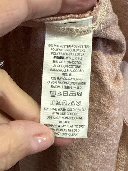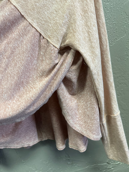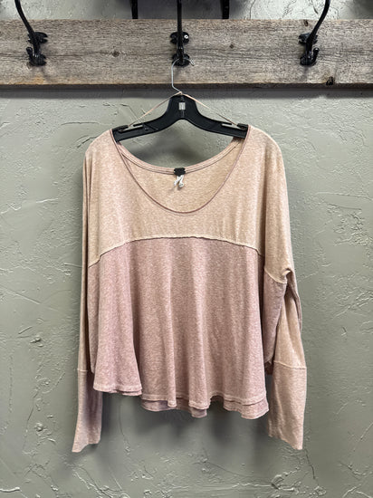 Description : Long-sleeve, loose-fitting scoop-neck top in a two-tone dusty rose/mauve with a horizontal seam across the chest and a flowy, slightly flared hem; lightweight knit fabric with a subtle sheen. The front shows dropped shoulders and extended sleeves creating a relaxed, oversized silhouette.