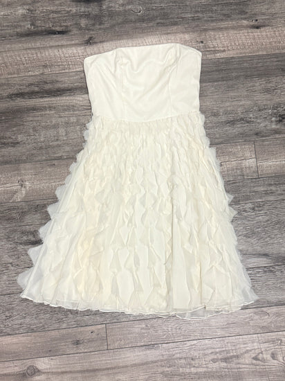 Description : 100% silk strapless dress in an off-white/ivory shade with a fitted bodice and a textured skirt made of layered, petal-like ruffles creating a soft, voluminous silhouette